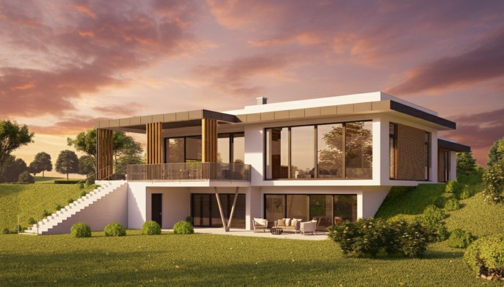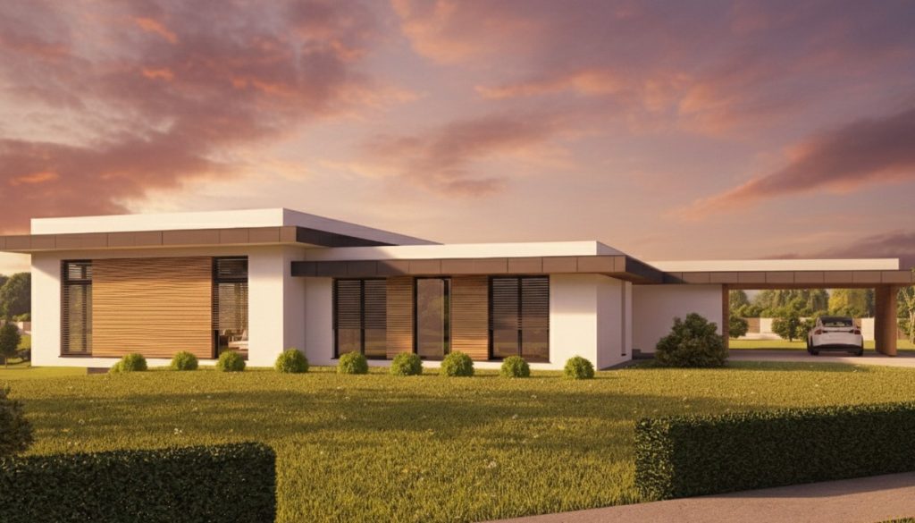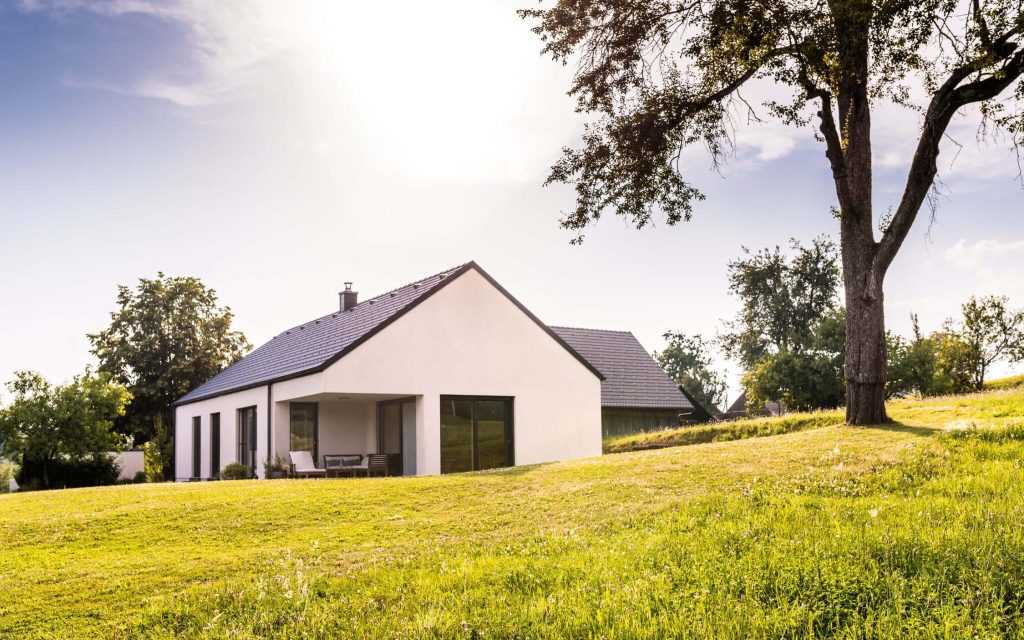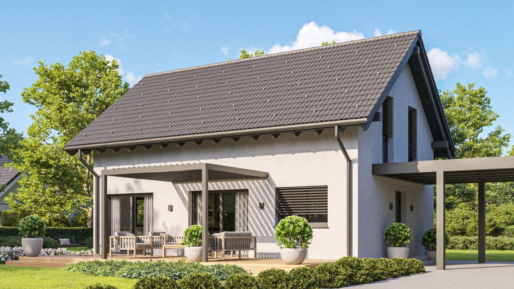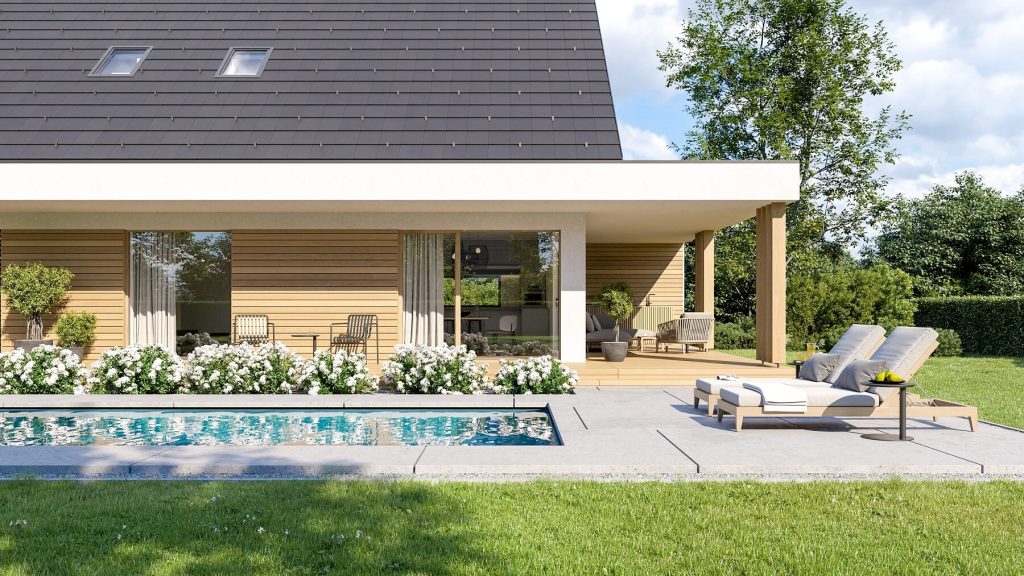 Pritlična hiša Gea 120 je vzdolžno zasnovana in s svojo daljšo stranico, obrnjeno proti jugu, optimalno izkorišča sončno energijo. Vsi ključni prostori, vključno z otroškima sobama, so dobro osončeni ter imajo neposreden izhod na vrt, kar zagotavlja močno povezanost z naravo. Podaljšan bivalni del s pokrito teraso omogoča udobno bivanje na prostem v vseh vremenskih razmerah. Prilagodljivi strešni nakloni poskrbijo, da je hiša primerna za različna okolja – od podeželja do urbanih območij in Primorja.