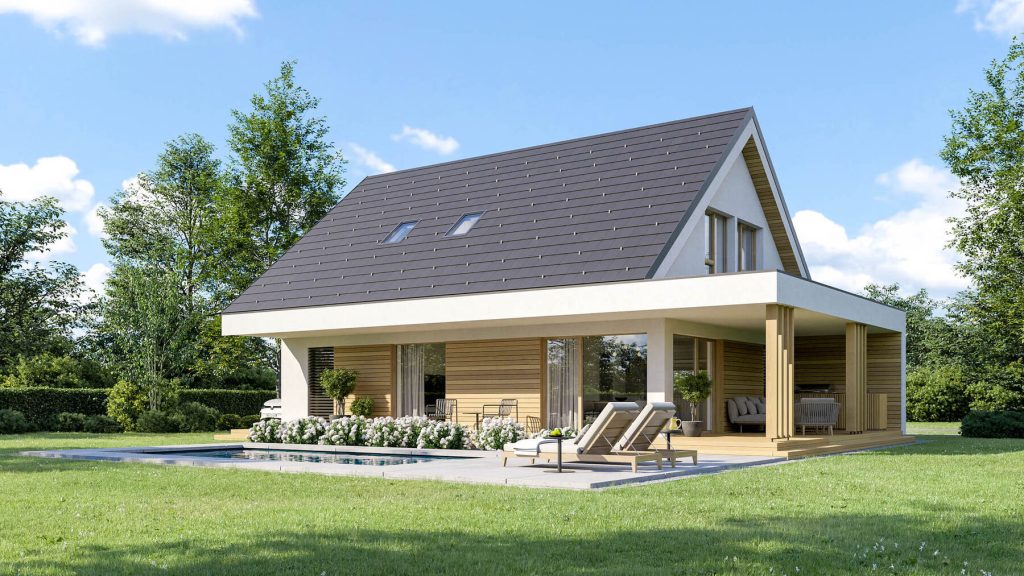 Klasična zasnova hiše Kaja-M 124 z dvokapno streho in tradicionalnimi napušči ustvarja brezčasno podobo, hkrati pa zagotavlja izjemno osvetlitev notranjih prostorov in čudovite poglede na okolico. Izpostavljeni izzidek tvori zavetrje za zunanjo, pokrito in naravno senčeno teraso, ki omogoča brezskrbno uživanje na prostem v vseh letnih časih. Arhitekturna zasnova z dvokapnico se idealno umešča v slovensko kontinentalno podeželje, pa tudi v mestna in primestna okolja, kjer s svojo preprostostjo in funkcionalnostjo ohranja skladnost z okolico. Hiša Kaja je na voljo tudi v velikostih 111 in 128 kvadratnih metrov.